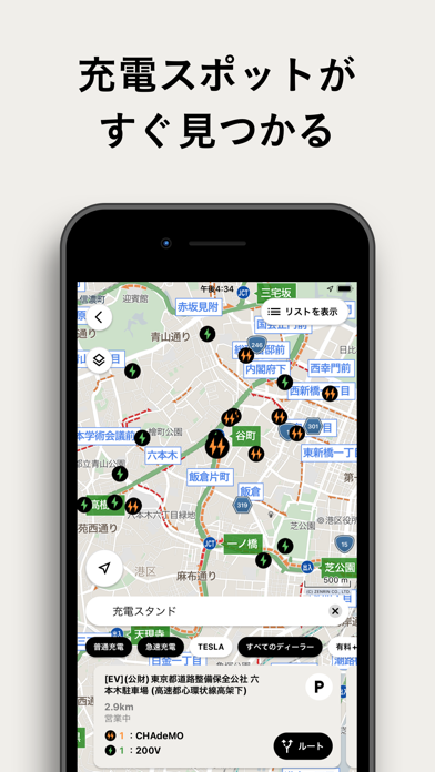 - 全国の充電スタンド情報を収録しており、マップ上ですぐに探せる