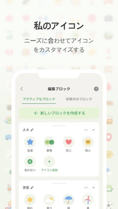 1日の気分を、アイコンをタップして記録。トータルな気分だけでなく「楽しい」「寂しい」といったより直感的な感情や、その日に会った人もアイコンで入力できます。またアイコンは自分の好きなものを新たに作成可能です。