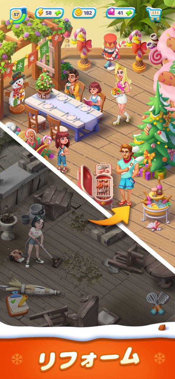 ボロボロに壊れてしまったレストランを、ストーリーが進行することで改装できます。最初は何もありませんが、徐々にテーブルやカウンターといったインテリアが追加。お店が発展していくワクワク感を味わえます。