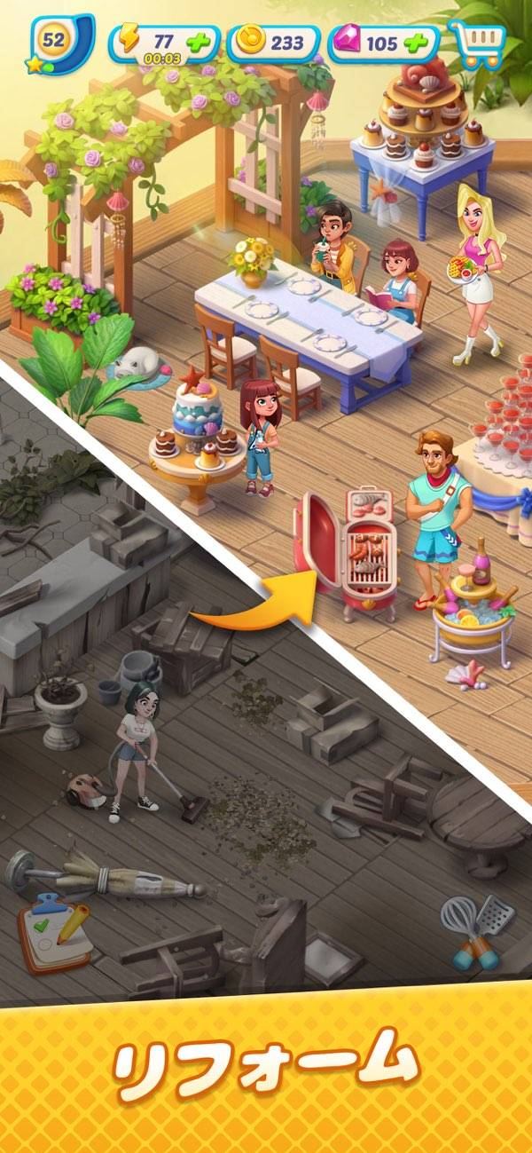 ボロボロに壊れてしまったレストランを、ストーリーが進行することで改装できます。最初は何もありませんが、徐々にテーブルやカウンターといったインテリアが追加。お店が発展していくワクワク感を味わえます。