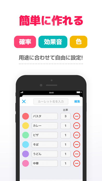 - 比率や色を自由にカスタマイズして、オリジナルのルーレットを作れる