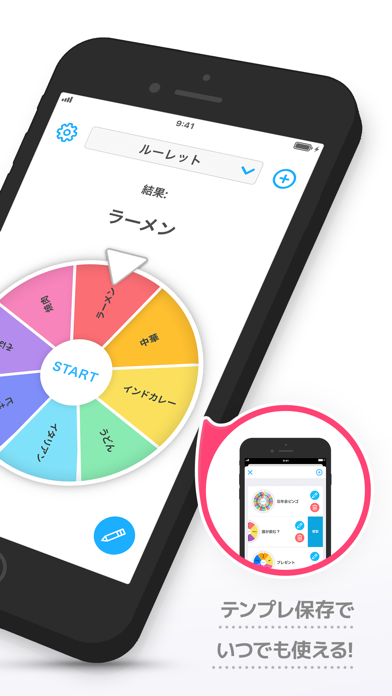 シンプル操作の使いやすさが特徴です。ランチのお店選びや罰ゲームなど、用途に合わせて項目を設定し「START」をタップするだけ。誰でも使えるルーレットで、毎日の生活をちょっと楽しくしてみませんか。