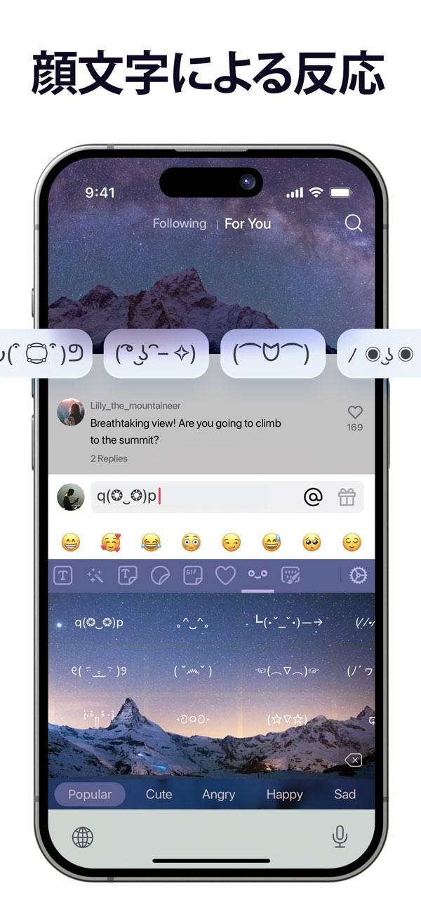 キャプションで使える顔文字も豊富にそろっています。Cute・Angry・Happy・Sad・Scared・Kissの6種類にカテゴリー分けされているため、探しやすいのも嬉しいポイント。ここでしか使えない独自の顔文字が多く、人目を引く投稿を作れますよ。