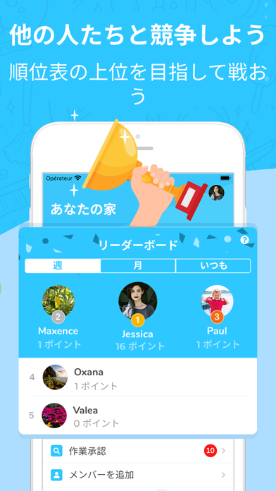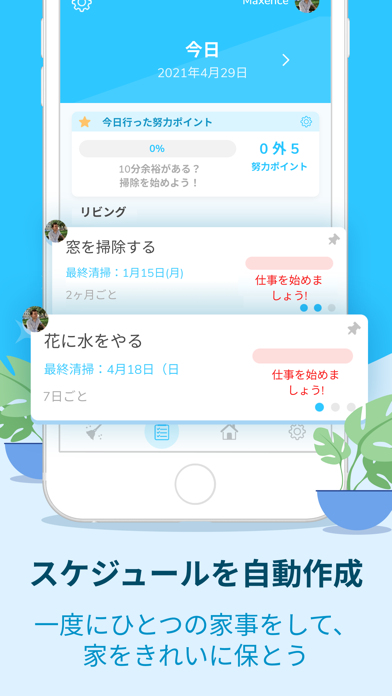 リビングや浴室といった部屋ごとに、やるべき家事を管理・リスト化できます。ホーム画面では進捗が一覧できるので、どのタスクが残っているかひと目でわかり、やり忘れを防げるでしょう。