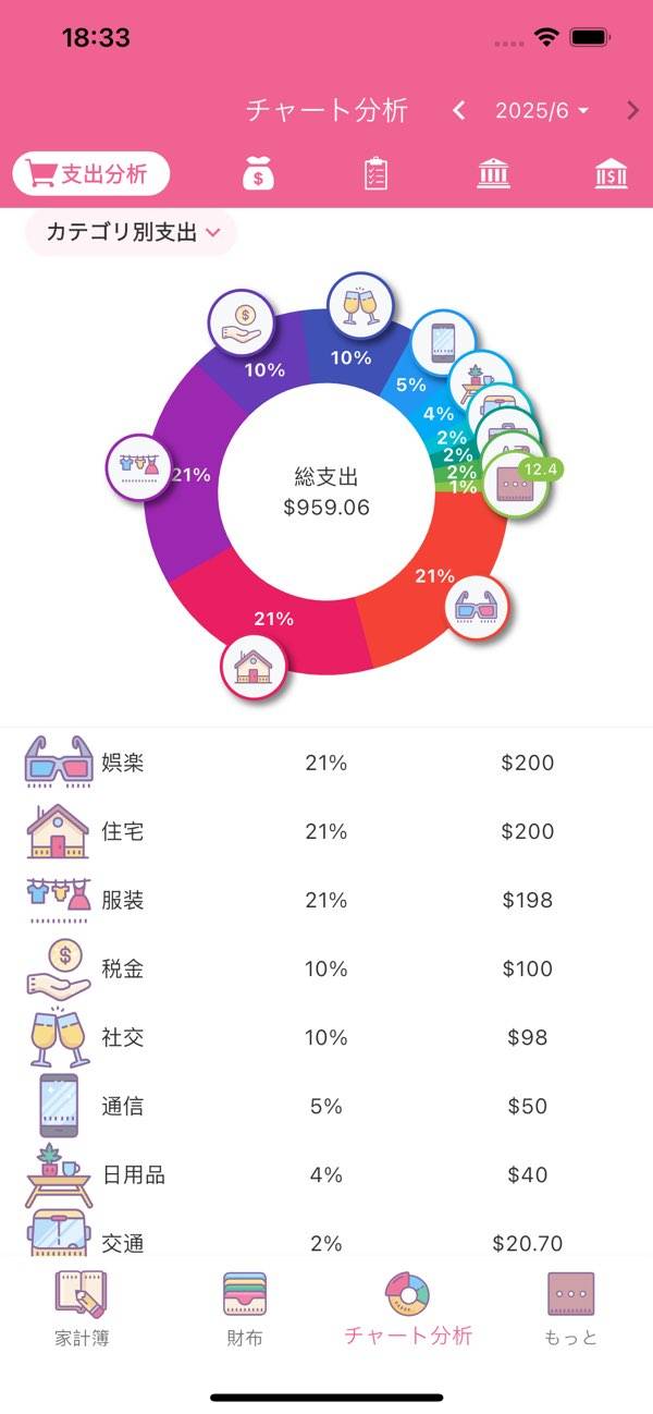 - 記録した収支は自動でグラフ化される。支出の割合を見たいときに便利