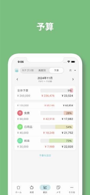 | 予算の設定 | 全体もカテゴリー別もできる |