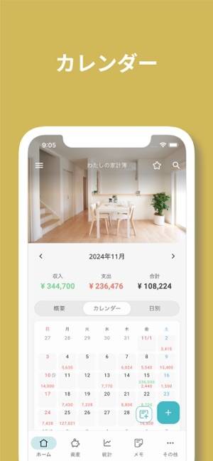 カテゴリと資産を選び、収入・支出を入力するだけでOK。口座連携などをする必要がないので、誰にでも使いやすいのが魅力です。カレンダーをチェックすれば、一ヶ月の収入と支出を瞬時に確認できます。