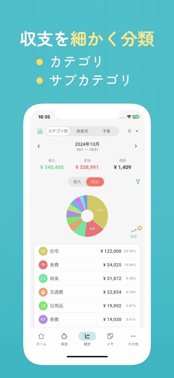 支出や収入をカテゴリやサブカテゴリで細かく分類できます。どの分野にどれだけのお金が使われているかを一目で把握できるため、家計の見直しや予算設定に非常に便利。よく使うカテゴリを作成することも可能です。