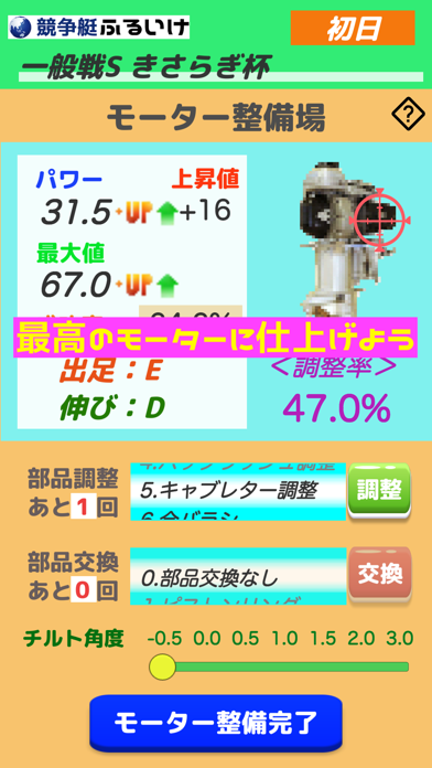 レースが終わるごとにボートのパーツ調整ができます。調整が失敗すると能力が下がるリスクはありますが、成功すればレースを有利に進められるでしょう。