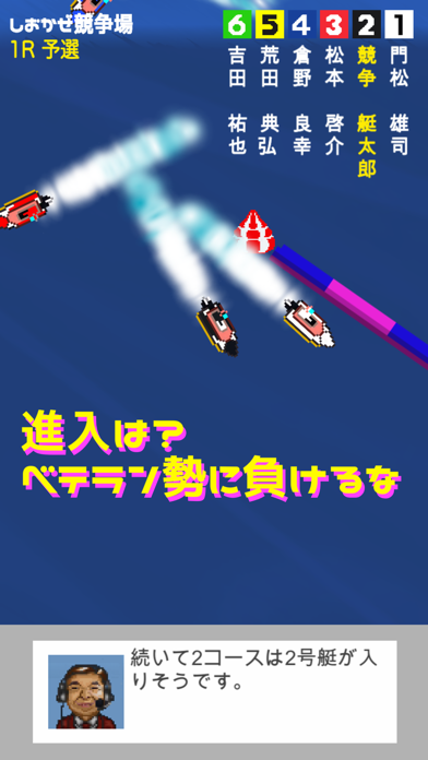 選手はすべて架空の人物ですが、ルールは実際の競艇と同じです。”アジャスト”と”全速”走行を行うタイミングが重要に。タイミングよくタップすると速度を落とさずに動き回れます。