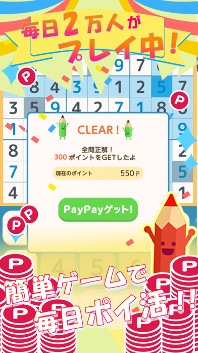 パズルを解いてポイントをゲット。カンタンな難易度もあるほかヒント機能つきなので、初心者でも遊びやすいでしょう。また高い難易度だとより多くのポイントがもらえます。