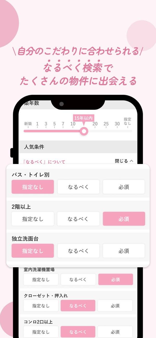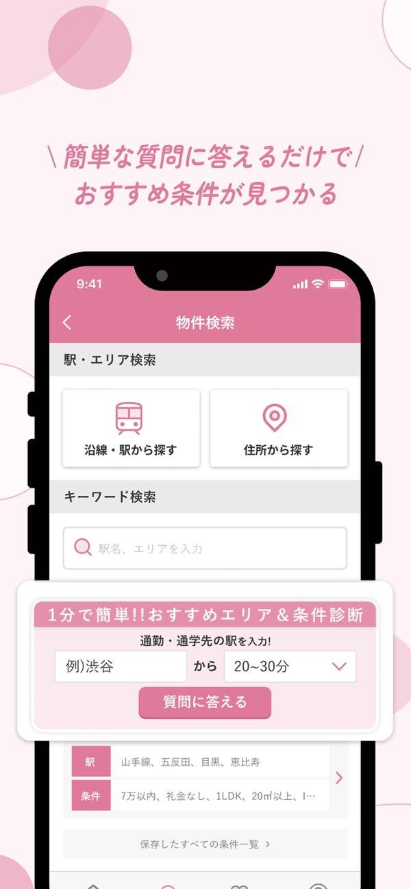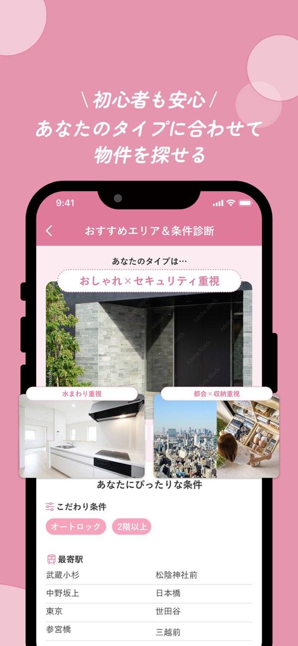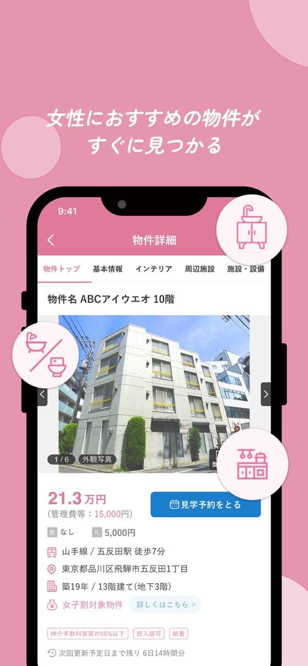 一人暮らしの女性向け賃貸検索アプリです。「洋服がたくさん入る」「料理がしやすい」など、女性が求めているような条件にあてはまる部屋を紹介してくれます。女性向け賃貸に絞って検索したい人におすすめ。