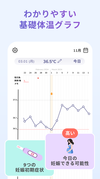 シンプルなデザインで生理や基礎体温などの記録&管理がしやすいのがポイント。配色も落ち着いており、気分を顔文字で表現しているのもかわいいですね。デザイン性を重視している人も、本アプリならきっと満足するでしょう。