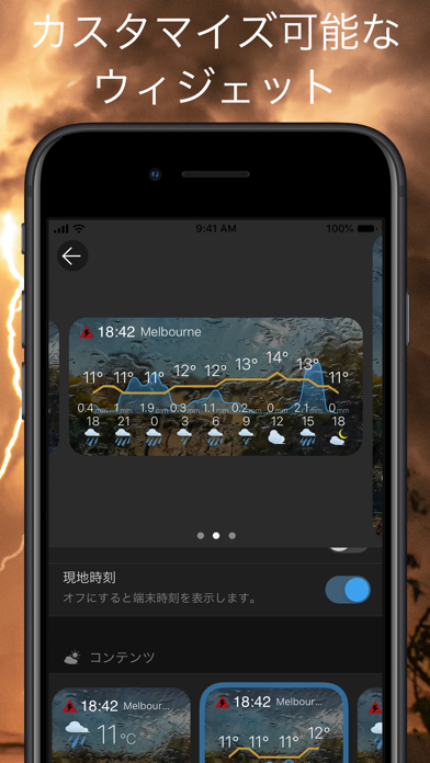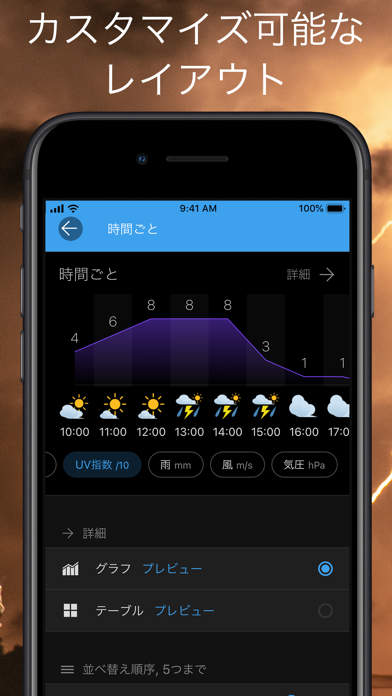 表示する情報の種類を自由に変更。見たい天気情報を優先してチェックできます。気温や降水確率など、必要なデータだけを選んで、自分だけの画面を作成。グラフが多くぱっと見で天気の概要がつかめるため、天気チェックがさらに便利になります。