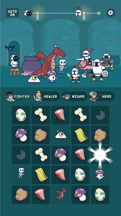 同じ食材同士を組み合わせて上にスライドさせると、モンスターが鍋から出現。モンスターをたくさん生産して、向かい来る敵兵をやっつけましょう。隣同士でないと消化できないなどの縛りがなく、初心者でも楽しくプレイできます。