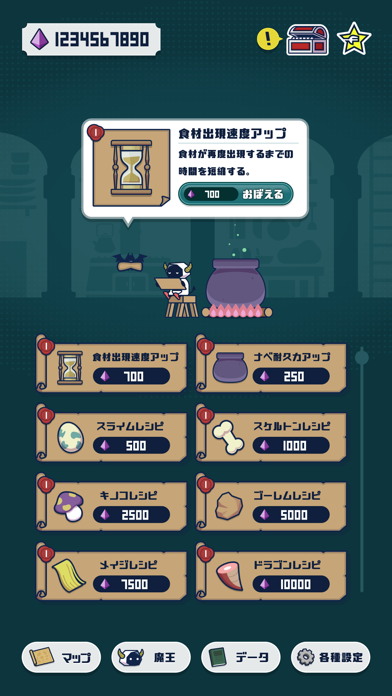 新しいレシピを覚えさせると、魔王やモンスターの能力が強化されます。攻撃力や食材生産速度などをアップさせましょう。レシピはステージをクリアする度にもらえる経験値を使って購入できます。