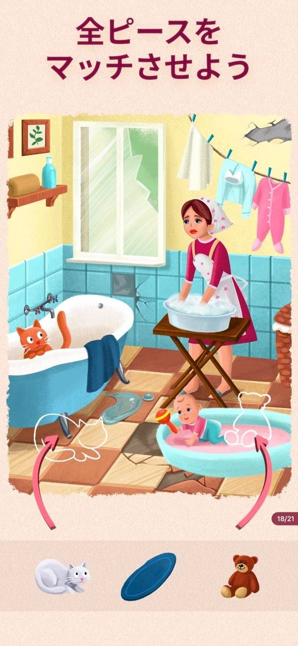 窓や小物が描かれたピースをはめていくと、絵に変化が……? ストーリー性も楽しめる内容になっており、じっくり腰を据えて遊びたくなります。