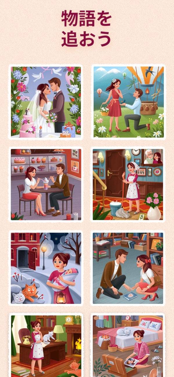 アーティスティックなイラストが描かれたパズルゲーム。例えばくじらの島、赤子を抱く女性、恋人たちが過ごす様子など、色彩豊かで美しい絵が多数眺められます。