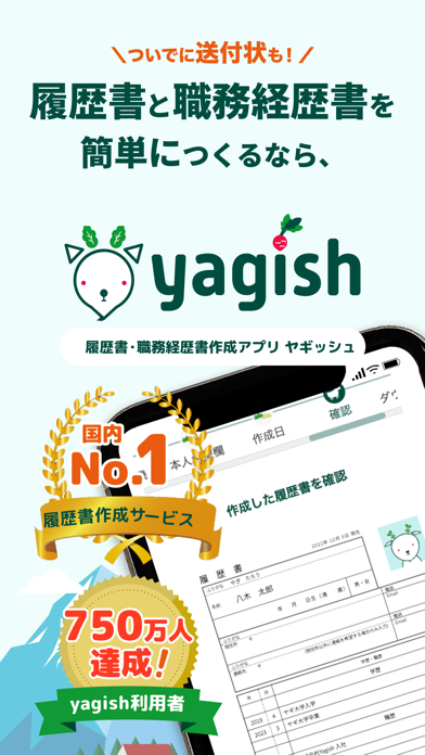 「Yagish」は750万人以上が利用する履歴書・職務経歴書作成サービスです。