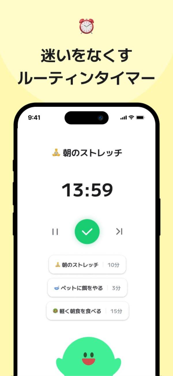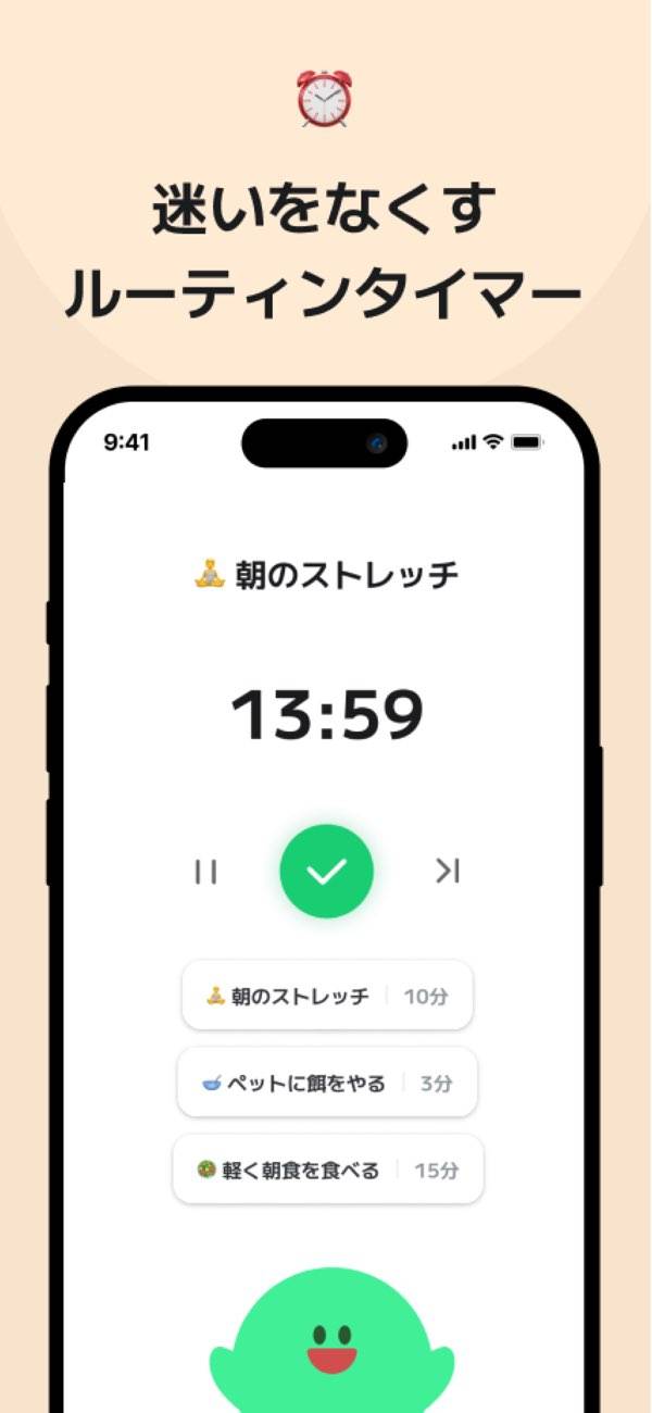 青信号システムが気に入って使っているルーティン管理アプリ。サプリ飲むとか、ストレッチするとか、ちょっとしたいくつかのルーティンをワンタップで記録できるのも使いやすい!こなした数に応じて赤、黄、青と信号が変わっていくから、「今日はあんまりできなかった」「明日はちゃんとこなすぞ」っていう振り返りがしやすいのが良い。あとUIとか、ちょっとしたときに出てくる丸いキャラクターとか、デザインがかわいい。課金しないと制限けっこうあるから、そこだけ気になるかな~