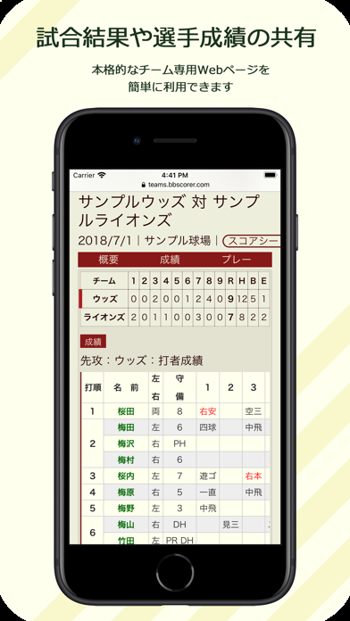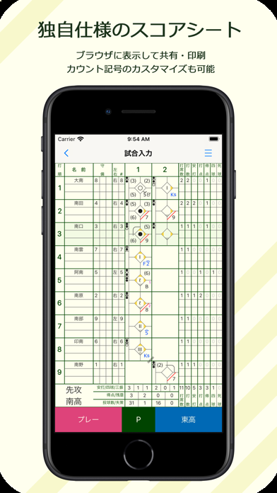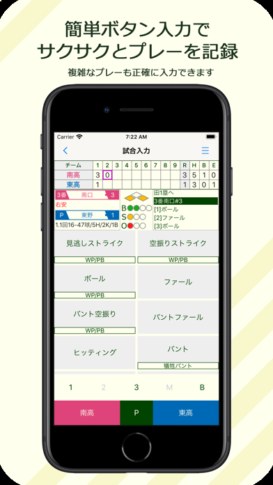 ストライクやヒッティングなどのプレーを、タップ操作でサクサクと入力できます。各種記録は自動的に集計され、スコアシートに表示。記録形式も紙のスコアブックに沿っており、知識がなくても正確な記載スコアブックが作れるようになっています。