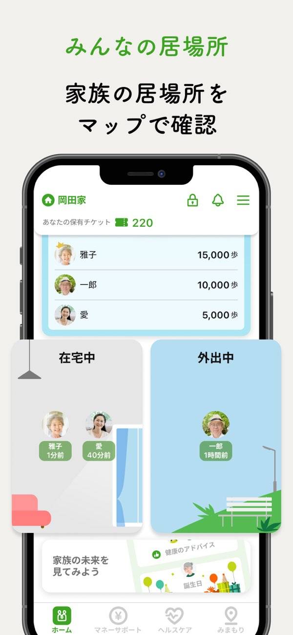 離れて暮らす親の今後に不安がありました。このアプリは登録した情報をもとに、お金・健康・生活の3つの観点からリスクを知らせてくれます。漠然とした不安がはっきりするので、具体的な対策を家族間で話し合えてます。スマホの位置情報機能で、家族の居場所が分かるのも安心ですね。