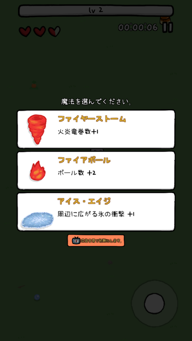 レベルが上がると、3種類の魔法の中から好きなものを選択。キャラクターは、敵を倒すと現れる水晶玉に触るとレベルが上がっていきます。魔法はファイヤー系、サンダー系と様々ですがどんどん敵の数も増えるため、広範囲の敵を攻撃できるタイプがおすすめ。