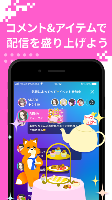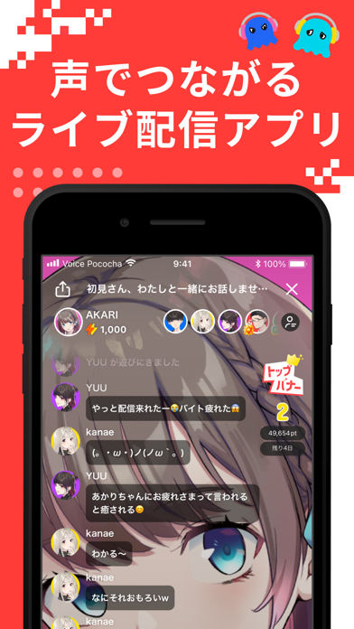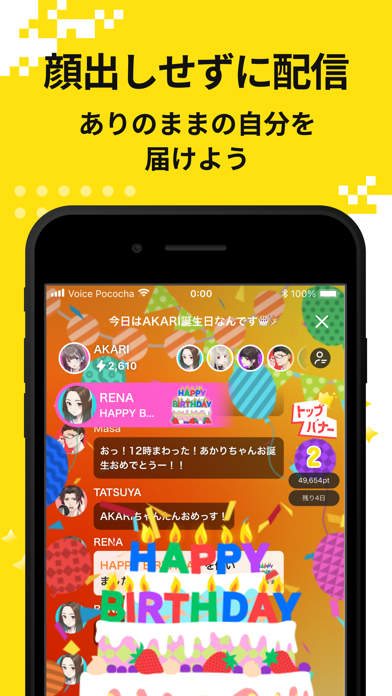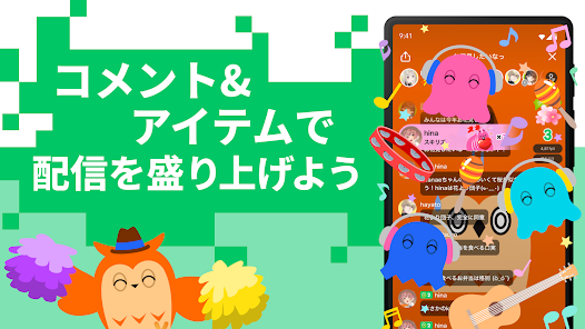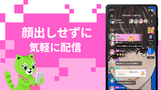 - 顔出し不要で気軽に配信可能。配信を盛り上げるアイテムもあり