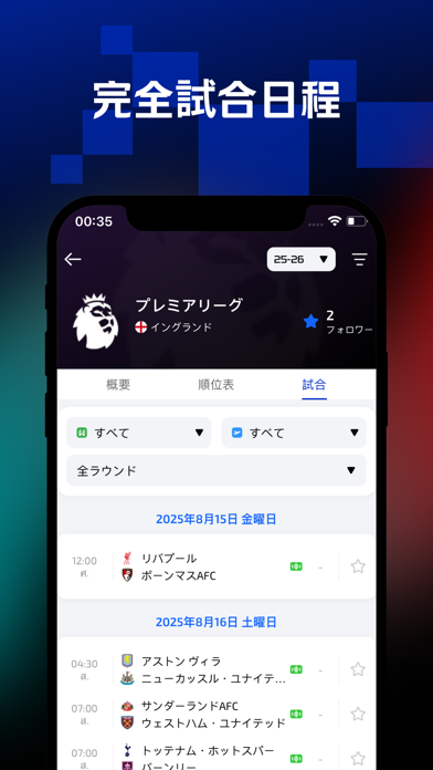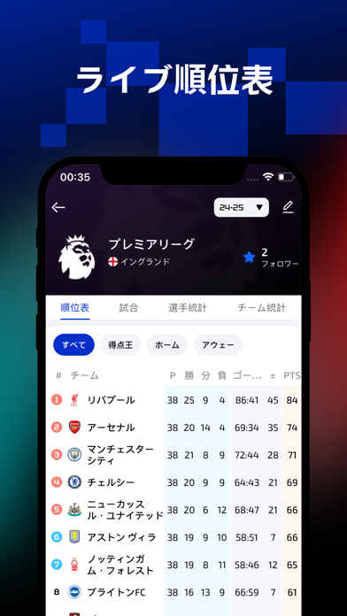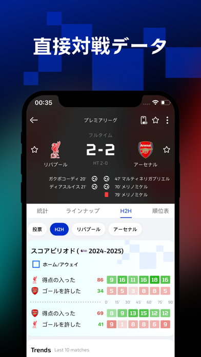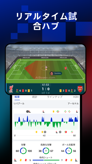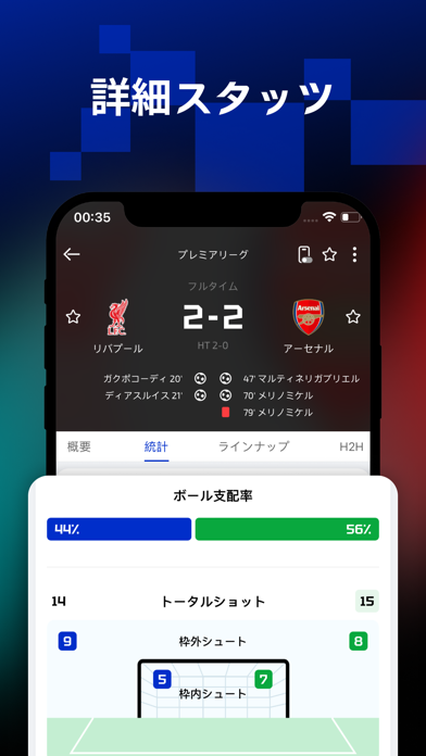 試合が進行中でも、リアルタイムで得点や主要なイベントを確認。このアプリは、ゴールやカードの情報を瞬時に更新し、試合の流れが手に取るように把握できます。ボールの支配率もわかり、試合をリアルタイムで追えるため、試合の趨勢がわかります。