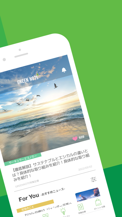 最新のサステナビリティ情報を毎日届けてくれるアプリ。気候変動や人権問題など幅広いジャンルの記事を収録しています。質問に答えることでポイントをゲット。ポイントは食品やクーポンと交換できます。ここだけしか読めない限定記事も多数配信。