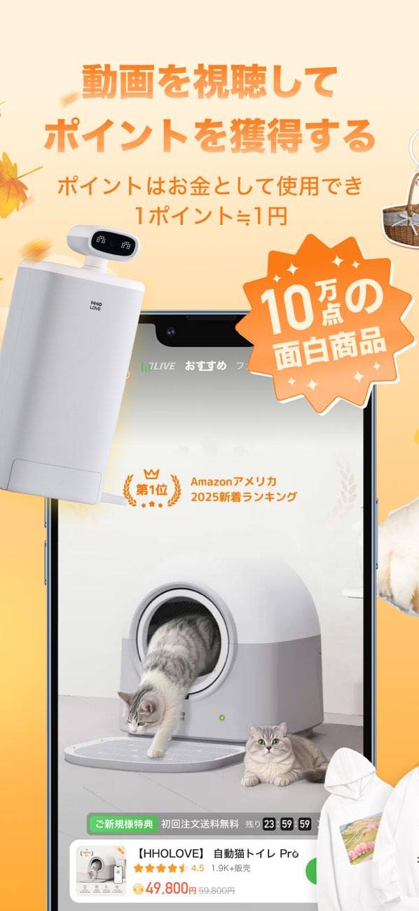 商品の動画視聴やレビューの投稿で、ポイントを貯められます。貯まったポイントは、1ポイント=1円として商品の購入の際に利用可能。1日に100ポイントまで獲得できるので、商品動画を視聴してお得にショッピングを楽しみましょう。