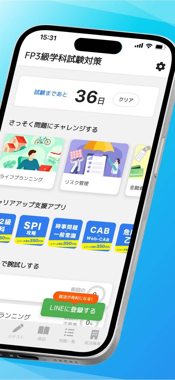 厳選された過去問から、FP3級に必要な知識を深められます。暗記モードで基礎的な知識を養い、小テストで確認。苦手問題の抽出機能も備えており、自分の弱点に合わせて効率的な学習ができます。試験予定日を登録しておけば、期限のカウントダウンも表示。適切な範囲とペースで、学科試験の合格を目指しましょう。