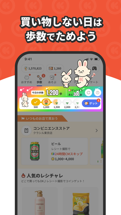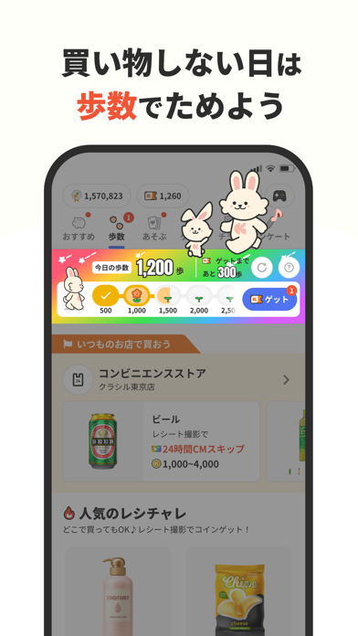 歩くだけでもポイントがもらえて嬉しい!他にもレシチャレというものがあり、そこに出ている商品を買ってレシートの写真を送るとポイントが貯まるのでお得にお買い物ができるのも嬉しいです!そのおかげで、かなりお得にお買い物できているのでおすすめです!