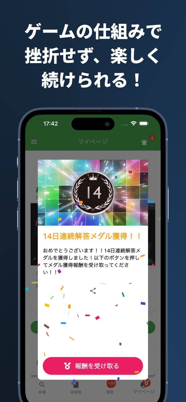問題形式で復習できるので、記憶に残りやすいでしょう。また復習達成や累計の回答数に応じて、メダルを獲得できる要素もあります。定期的な復習と報酬をかけ合わせることで、継続に繋がりやすい仕組みです。