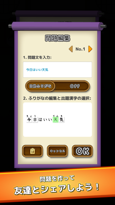 漢字の範囲は検定の10級から2級まであり、小学生から高校生まで楽しめるアプリです。
