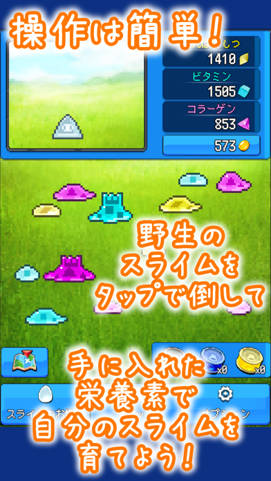 スライムがいっぱいのファンタジー世界が、ゲームの舞台です。プレイヤーの目的は、スライムに餌を与えて進化させ、図鑑のコンプリートを目指すこと。野生のスライムから3種類の“栄養分”を抜き取り、レベルアップさせましょう。