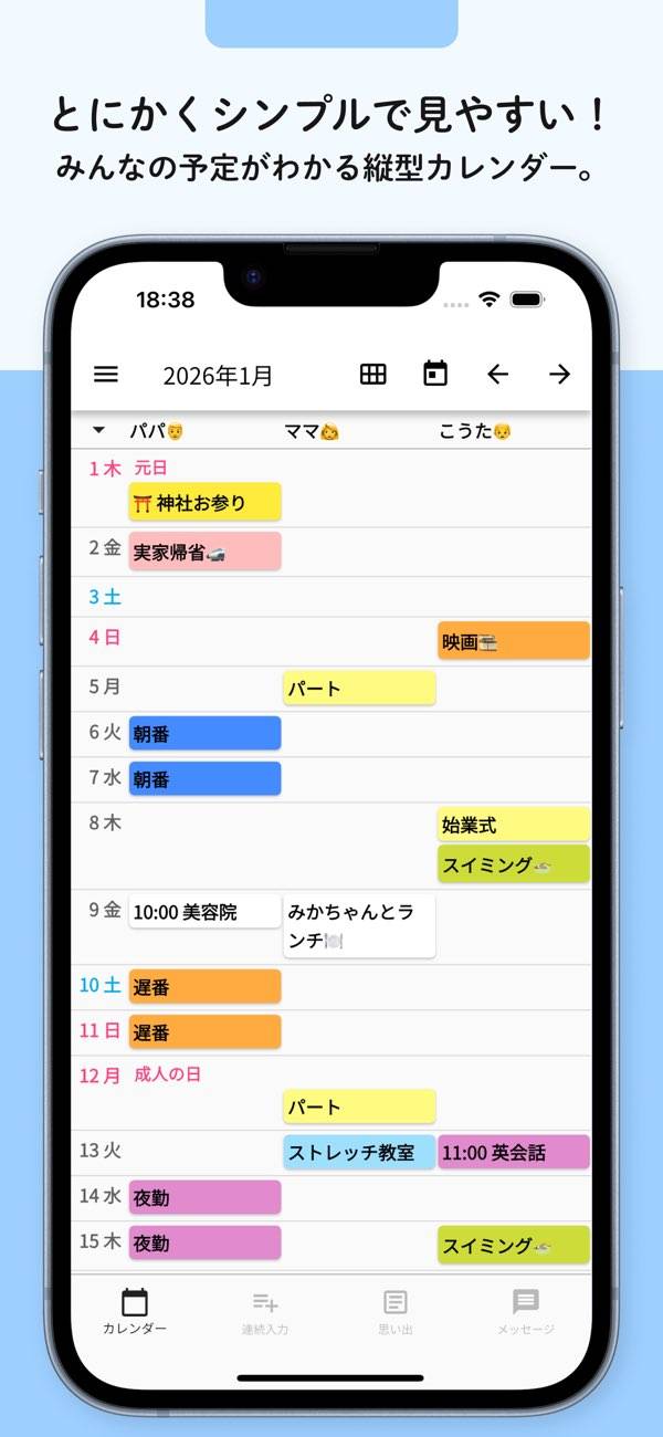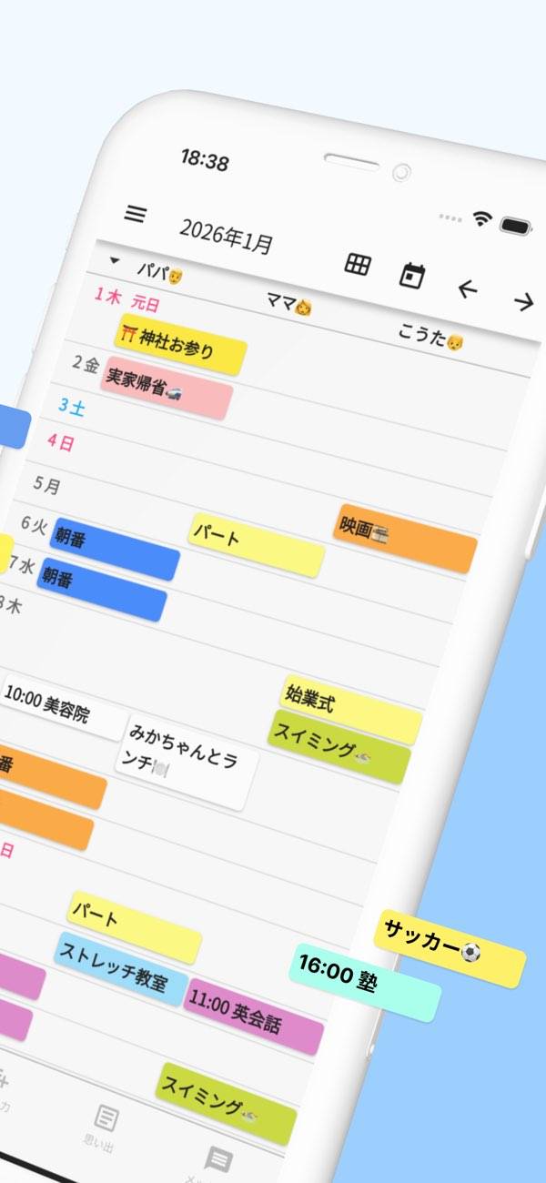 - 「お父さん」「お母さん」など一人ひとりの予定を書き込めるアプリ