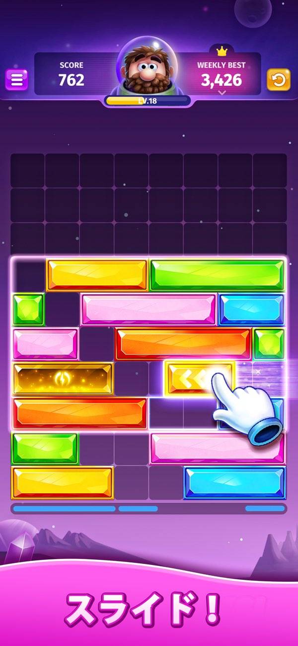 宝石のようなカラフルなブロックをスライドして消していくパズルゲーム。上からブロックが降ってくるのではなく、下から出現するのが斬新です。ブロックの色を合わせて、どんどん消していきましょう。