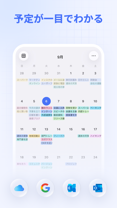 | 連携カレンダー | iOS、Google、iCloud、Exchange、URL(iCal形式のカレンダー)、CaiDav、Outlook |