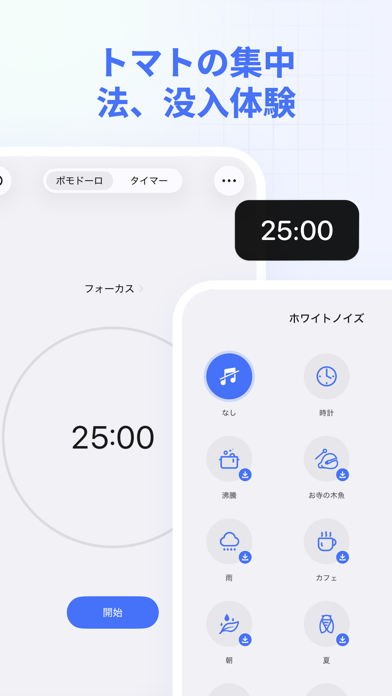 有料機能では、作業の効率をアップさせるポモドーロタイマーが組み込まれています。作業に集中する時間と休憩時間を交互に設定し、続けてタスクに取り組むことで、集中力を維持。波の音や雨音などの音もかけられます。