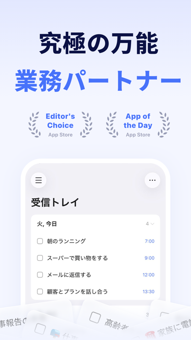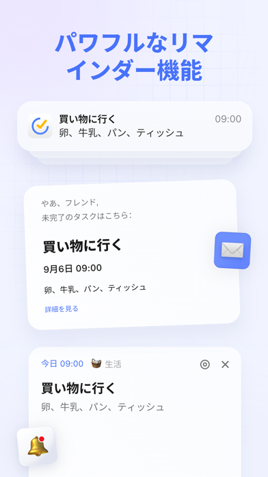スマートフォンで手軽にタスク管理ができるアプリ。直観的に理解できる入力画面で、要件や期限を入力するだけのシンプルな操作。日々の予定を見失うことなく整理できます。リマインダ―で予定を忘れる心配もなし。
