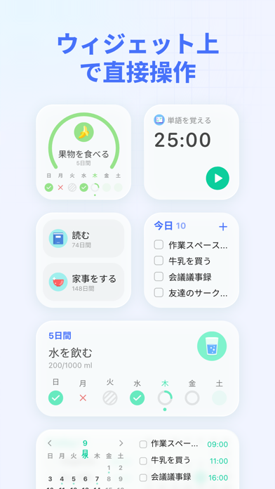 ウィジェットのテンプレートが数多くあります。自分の必要な情報だけをウィジェットにしてホーム画面に表示。アプリを開かなくても今日やるべきことなどが目に入り、仕事を効率化させられます。