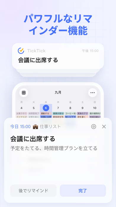 いろいろな情報を網羅したToDoリストを簡単な入力で作れます。期限や説明を入れたり、画像を添付したりが可能。重要度の高さも指定でき、何を優先的に行えばいいかわかります。アラームの設定もできるので、約束の時間などがある時にも便利。