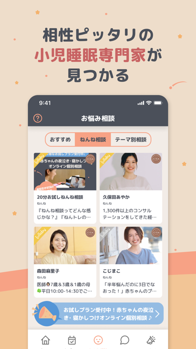 夜中の授乳や離乳食の進め方、発達や性格の心配まで、育児の幅広い悩みに対応するコンサルタントとやりとりが可能。予約もアプリからすぐにできるので、思い立ったときに頼れるのがありがたいところ。誰かがそばで話を聞いてくれるという安心感が、疲れた心にそっと寄り添ってくれます。