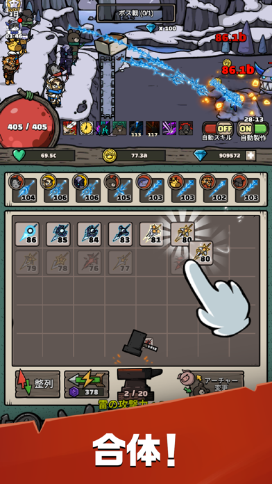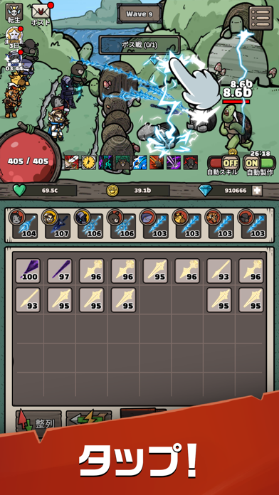 バトルは基本オートで進行、アプリを切っていてもお金を稼いでくれます。結構やることもあり、矢の製作、アーチャーの強化、転生など多彩な強化要素が用意されています。画面に「矢を製作」など目標が表示されるため、何をすべきか迷う心配はありません。
