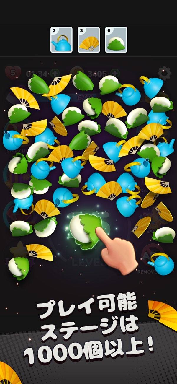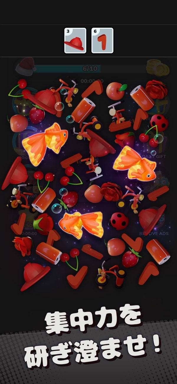 指定された数のアイテムを消していく3Dデザインのパズルゲーム。操作はタップだけなので手軽に遊べるのが特徴です。画面下部には容量があり、これが埋まってしまうとゲームオーバーに。アイテムは同じものを3つ揃えると消えるので、タップする順番も重要です。