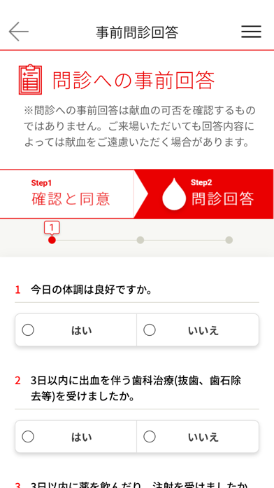 献血当日の問診を、スマホから回答できます。「はい」か「いいえ」の2択形式のため、スキマ時間にサクッと回答が可能。事前回答をスマホで済ましておけば、献血当日の待ち時間を減らせるでしょう。