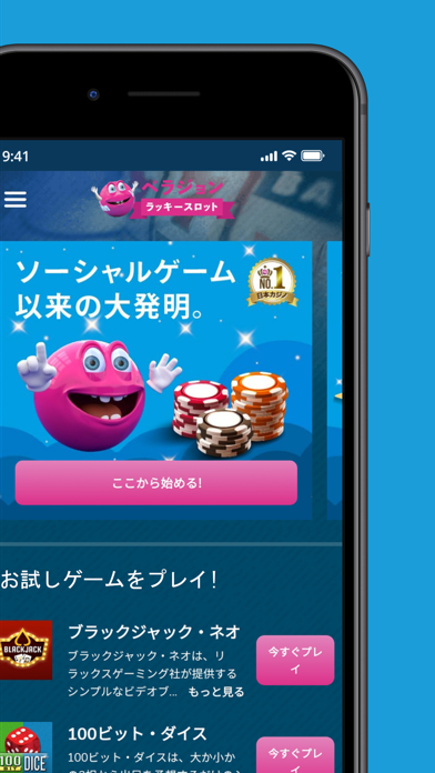 オンラインカジノ『ベラジョン』の一部ゲームを遊べます。本アプリからオンラインカジノのスロットやルーレットの無料お試しプレイが可能。オンラインカジノの雰囲気を掴みたい人向け。