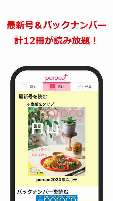 無料版では、バックナンバーを1冊まるごと読むことができ、さらに「クーポンを見た」と伝えるだけで、お得な「porocoサービス」を利用してお店を利用することが可能です。