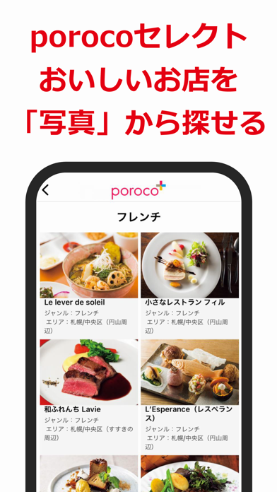 porocoセレクトのお店を、現在地周辺・ジャンル別・写真とさまざま方法で楽しくお店探しが出来るのが他のアプリにはない特徴だと思います。